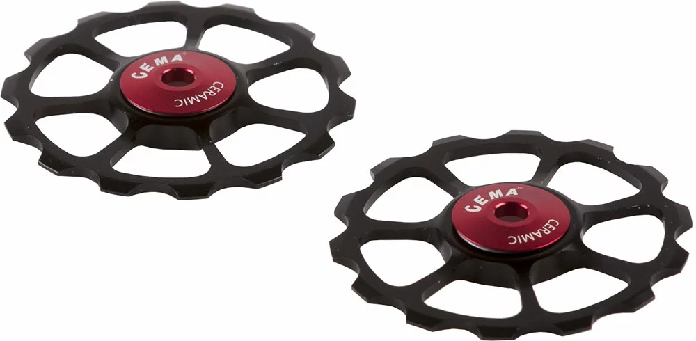 Set de galets de dérailleur de rechange Cema Oversize pour dérailleurs Shimano 10/11 vitesses avec cage de dérailleur longue. Selon le modèle, les galets de dérailleur ont un corps en aluminium usiné CNC et sont équipés d’un roulement SRC en céramique, entièrement en céramique ou en acier inoxydable.