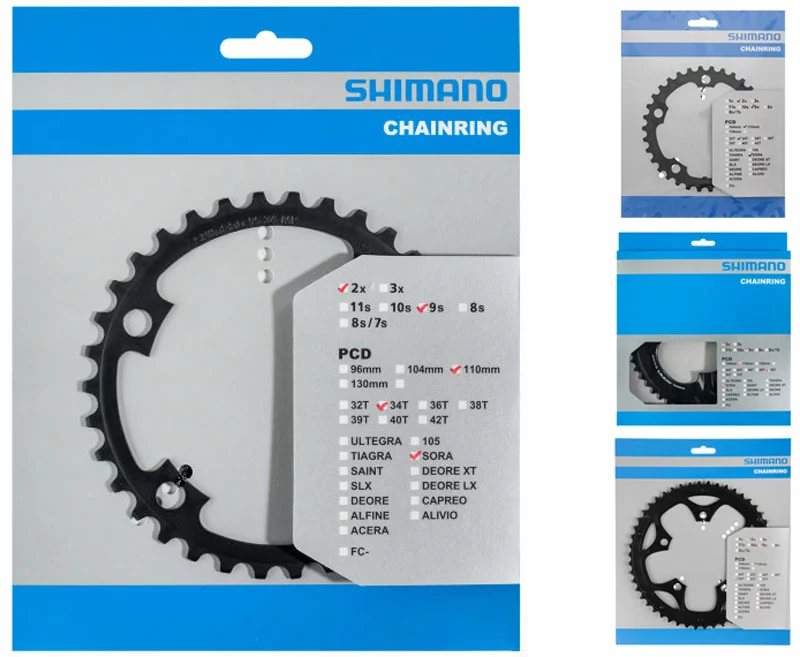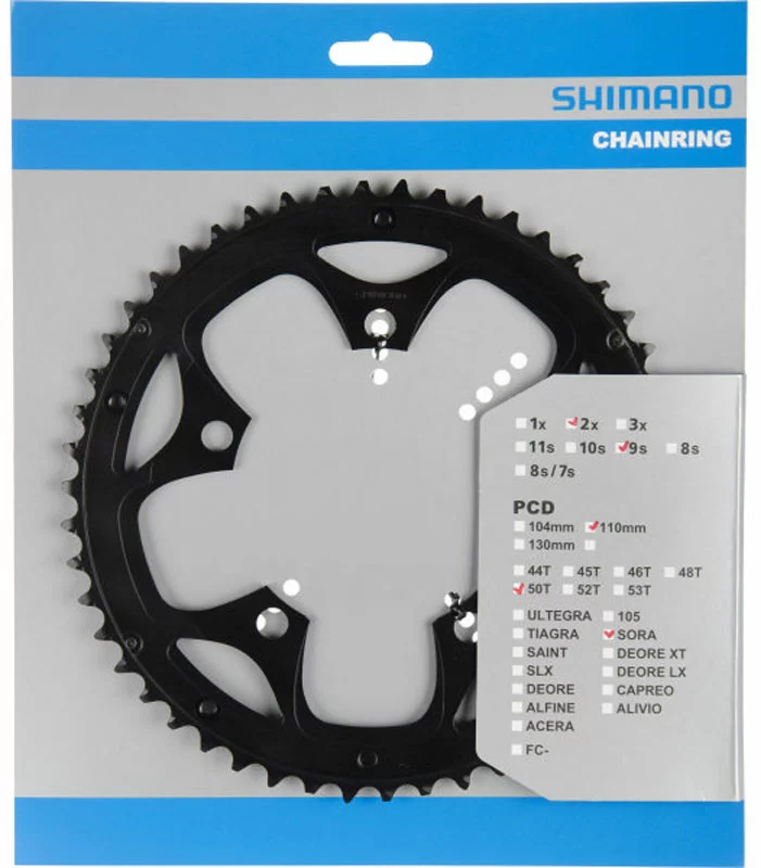 Plateau de remplacement Shimano pour le pédalier Sora 2 x 9 vitesses FC-R3000 (MP) à 4 bras et le pédalier FC-R3000 / FC-3550 à 5 bras avec anneau de protection de la chaîne.