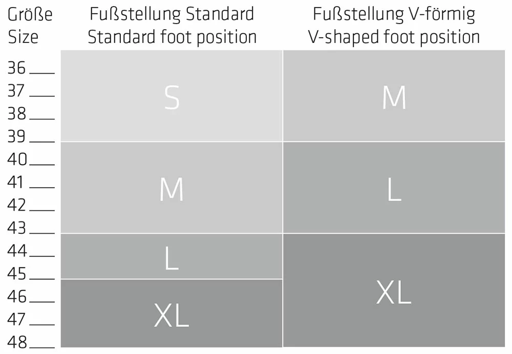 La surface de contact de nos pédales est toujours horizontale. Plusieurs vendeurs de produits soi-disant ergonomiques proposent des pédales ou des chaussures avec un angle préinstallé, le fameux V-wedge. Dans ce cas, le pied est légèrement surélevé vers l’intérieur. Ce concept est très controversé parmi les experts. L’être humain est habitué à marcher depuis des millions d’années sur une surface plane. Même si le mouvement de pédalage pour le développement biomécanique de l’homme est encore assez nouveau, de sorte que l’angle du pied est un niveau très individuel. Ainsi, il y a probablement encore plus de personnes qui ont besoin d’une cale dans la direction opposée. L’alignement des pieds est amélioré dans la chaussure et mieux avec des semelles.
