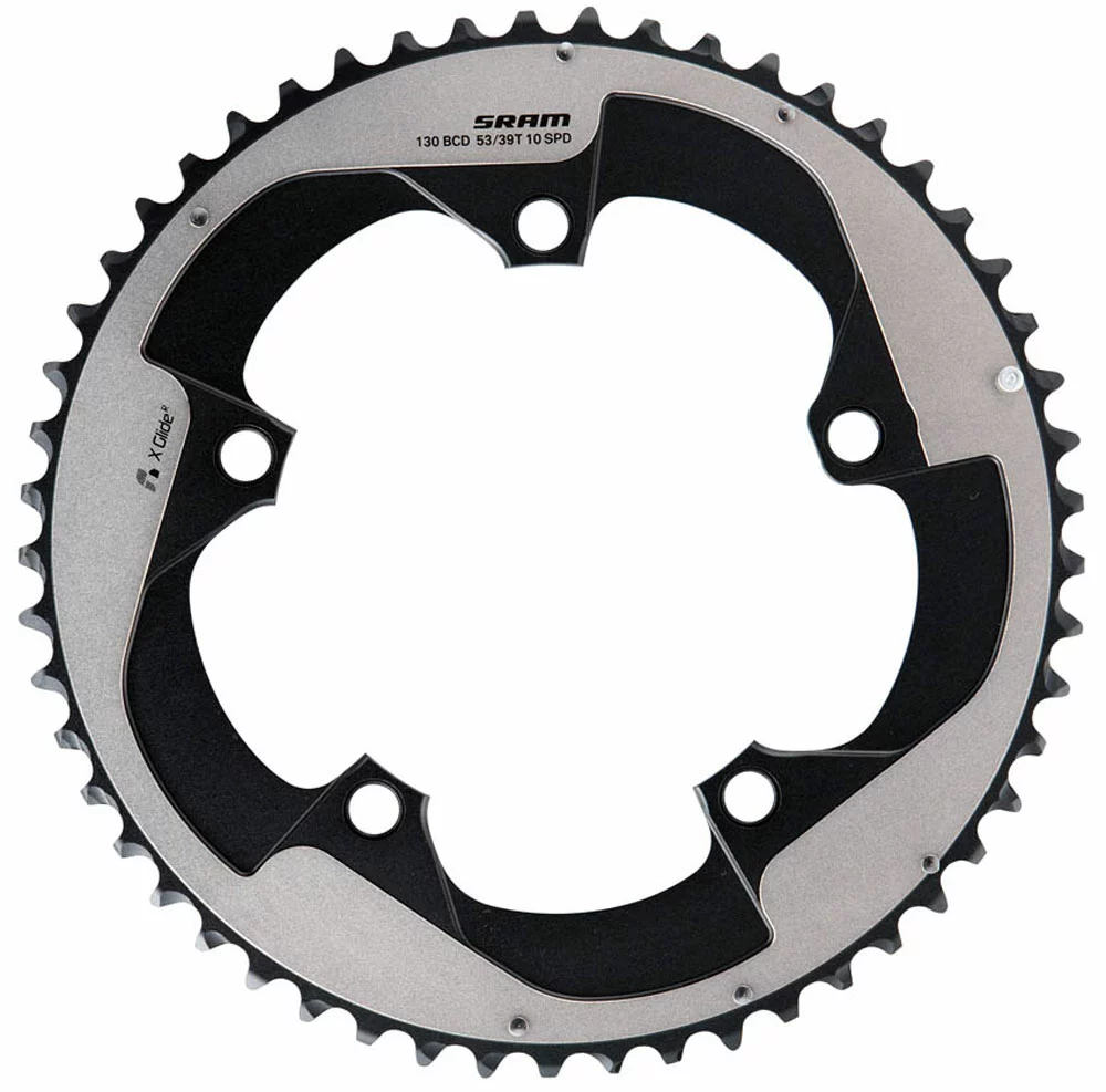 Plateau de rechange Red X-Glide avec un cercle de trous de 130mm et 39 ou 53 dents pour manivelles de vélo de course SRAM YAW. Remplace ton plateau usé ou échange-le pour modifier le rapport de transmission des vitesses.